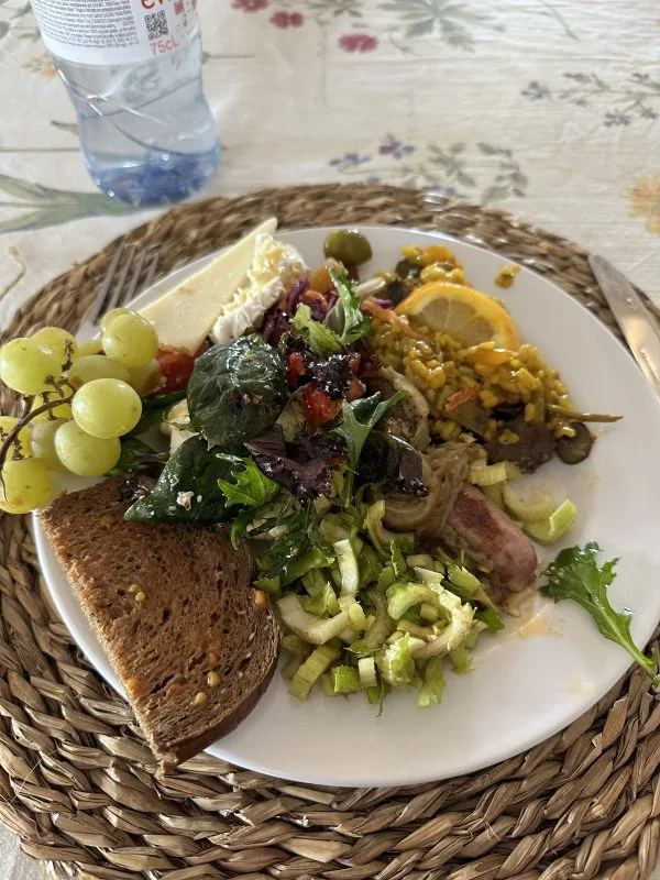 Het is 22:30 uur en er ligt voor iedereen een hele vis, salade en een soort schaaldieren ovenschaal klaar.