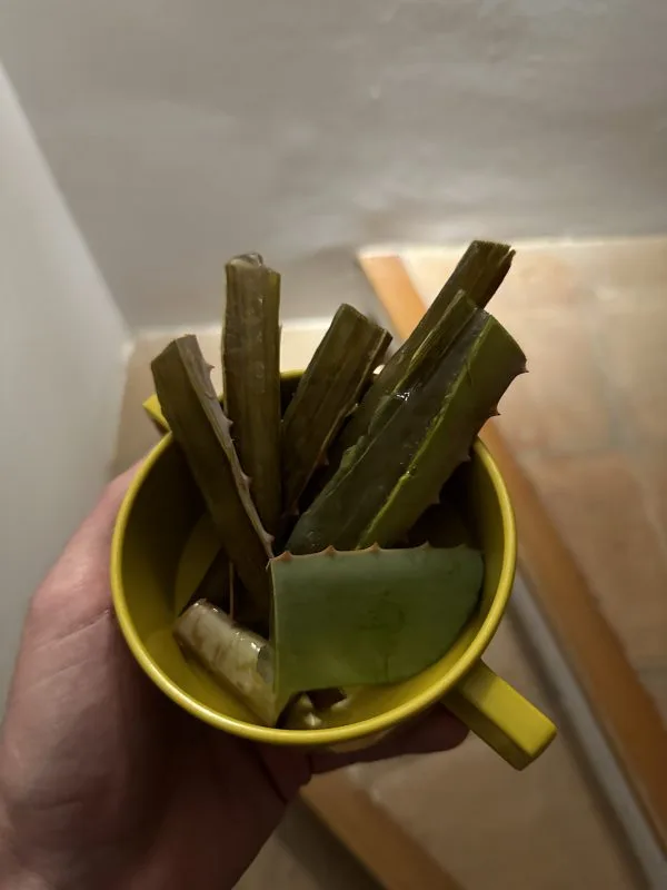 Ze lacht en zegt: nee, maar we hebben aloë Vera in de tuin waarna we stukken afknippen die ik mag gebruiken als after sun. Ik ga als een soort slijmerige slak naar bed door de aloë vera op m’n gezicht, nek en schouders.